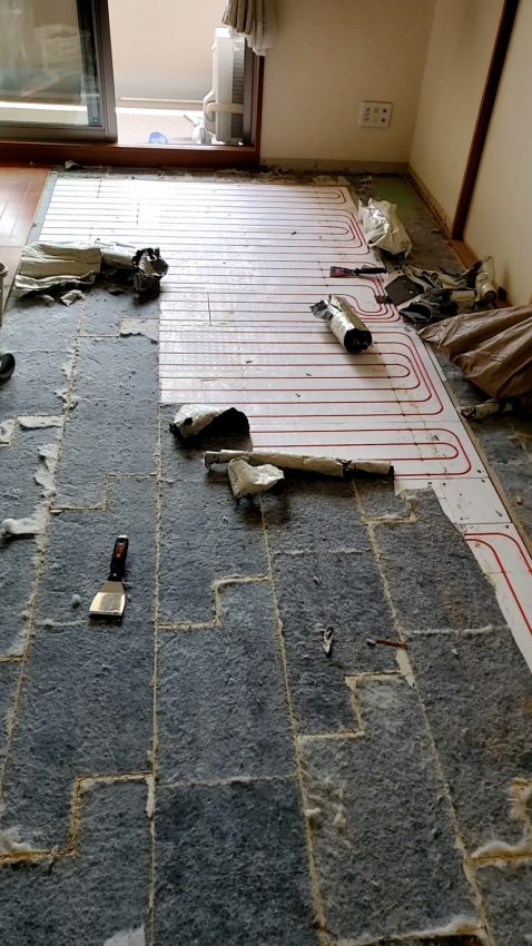 マンションの床暖房のフロア貼替工事、ヒヤヒヤ😱少しずつ、少しずつめくります❗