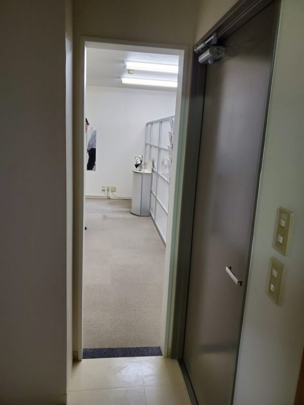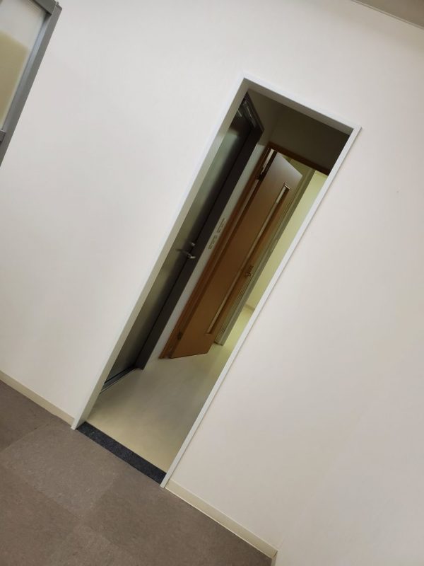 壁の向こうは、社長様含め従業員の方のデスクワークスペースです。こちら側は、会議室や給湯室、トイレがありました。確かにここをくりぬけば、廊下に出ずに移動が楽々🎵