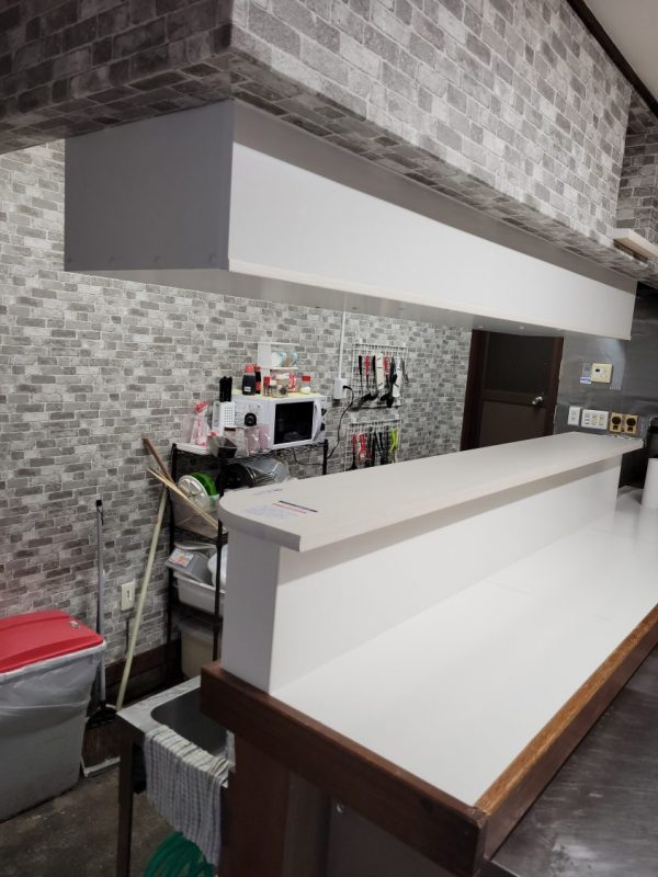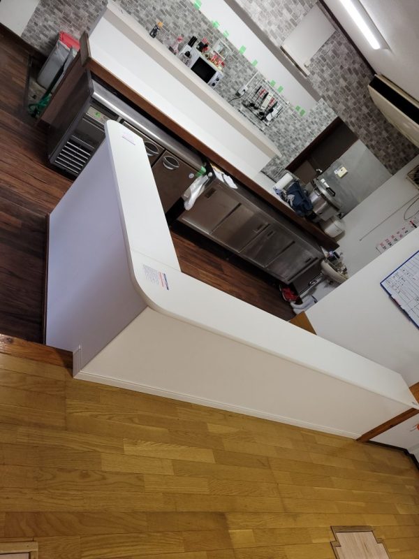 配膳仕込カウンターと接客カウンター、厨房吊り収納等の工事依頼です。