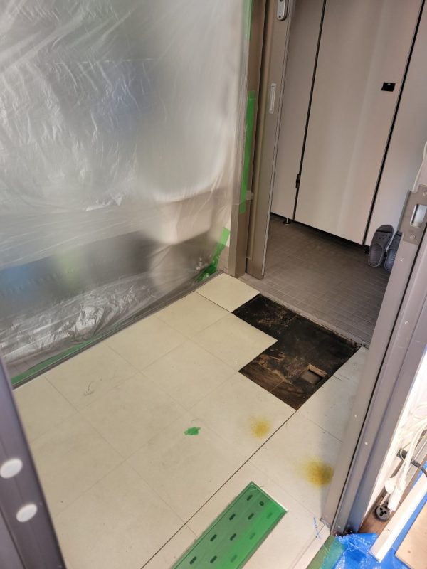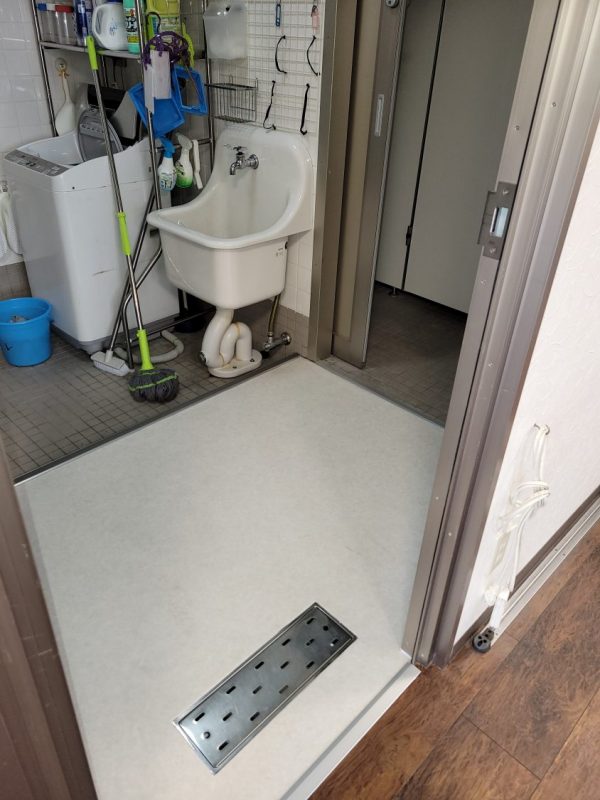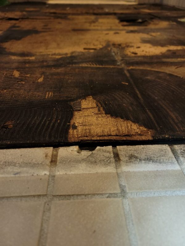 トイレとの取り合いからの水の侵食による傷み傷んだところを補修しクッションフロアーの下地にベニヤを上張り