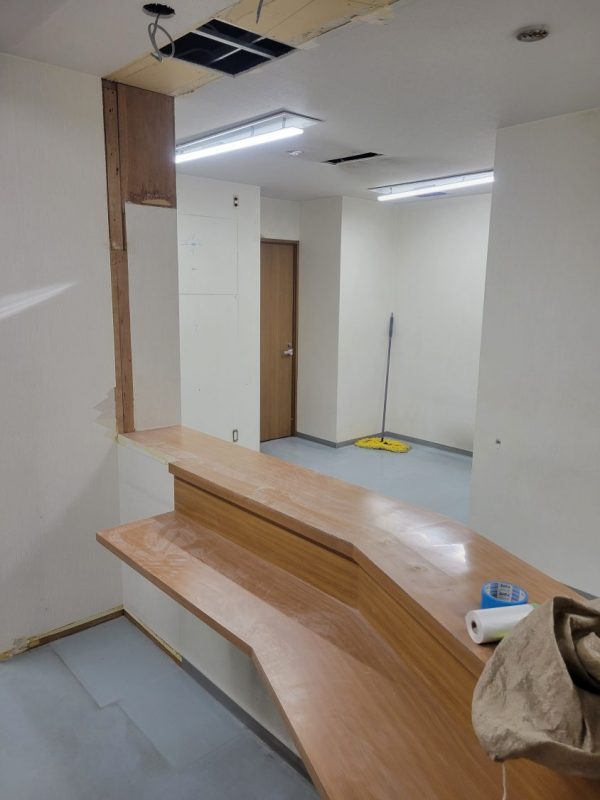 間仕切り解体、天井壁クロス張り替え、カウンターダイノックシート上張り、床はカーペットタイル